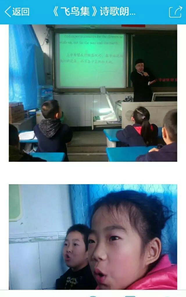 一个清晨,孩子们一个个正襟危坐,手拿《日有所诵》,开始每天的晨读。一缕缕金色的阳光跳进我们的教室,照在孩子们的小脸上,照在孩子们的小手上,照在孩子们手中的《日有所诵》上。我们读到这样一首诗:“夏天的飞鸟,飞到我窗前唱歌,又飞去了。秋天的黄叶,他们没有什么可唱,只叹息一声,飞落在那里。”我在教这首诗的时候,运用特级教师李吉林老师的“情境教学法” ,把教室窗外洋槐树上的小鸟和树上的黄叶作为参照物,让孩子们一边朗读,一边看着窗外的小鸟和落叶诵读这首诗,同时辅以我教给孩子们的朗读技巧(音准、断句、重点词、实声虚声、表情、体态语等),风神摇曳,情深景真,给孩子们留下了深刻的印象。整个教室都回荡着我和孩子们的诵读声:“夏天的飞鸟,飞到我窗前唱歌,又飞去了……”身临其境,我和孩子们把一百多年前泰戈尔老先生的诗读到了自己的心中,扁平的书面铅字被我们演绎成了立体的有声文字。此外,我还把小诗板书在黑板上,就这样,充满激情的朗读配以漂亮的粉笔书法,这种境界,是何等的美轮美奂。