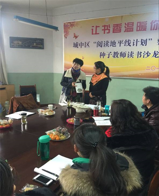 元月15日上午九点,观门街小学三楼会议室已经是暖意融融、笑声不断了。城中区“阅读地平线计划”整本书教学种子教师齐聚一堂,开始了以“书香温暖你我”为主题的教学沙龙活动。参加本次活动的除20位种子教师以外,还有12位热心于儿童阅读的各校领导、老师。