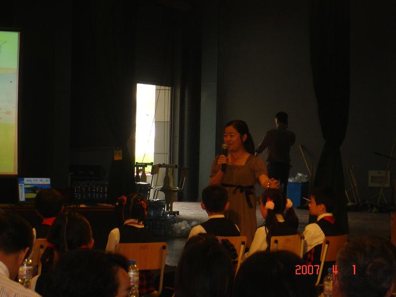 又是一个年轻的男老师,白衣黑裤,他带给我们什么样的精彩呢。仔细听来,真有点说评书的味道呢。会场不时传来开心的笑声。以这种方式给孩子们讲故事,给人耳目一新的感觉。虽然刚刚有老师已经说过这个故事,但真是让人感到了相同的故事有不同的讲法的乐趣。“每个人都有缺点,如果不及时改正的,没准那个没头脑就是你哦……”