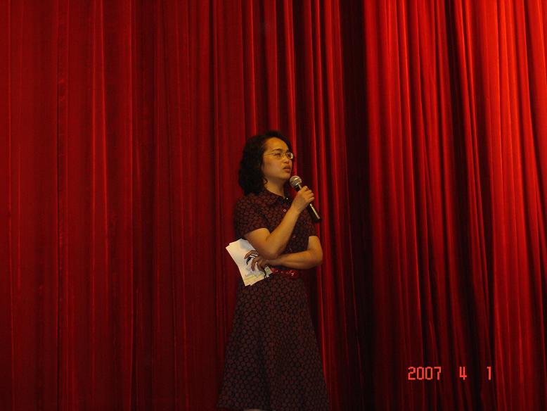 首先上场的是浙江的朱页老师,一个美丽的江南女老师,一身白色的小套裙,披肩的长发,动听的声音。她带给我们的是著名童话作家王一梅的《鼹鼠的月亮河》。
