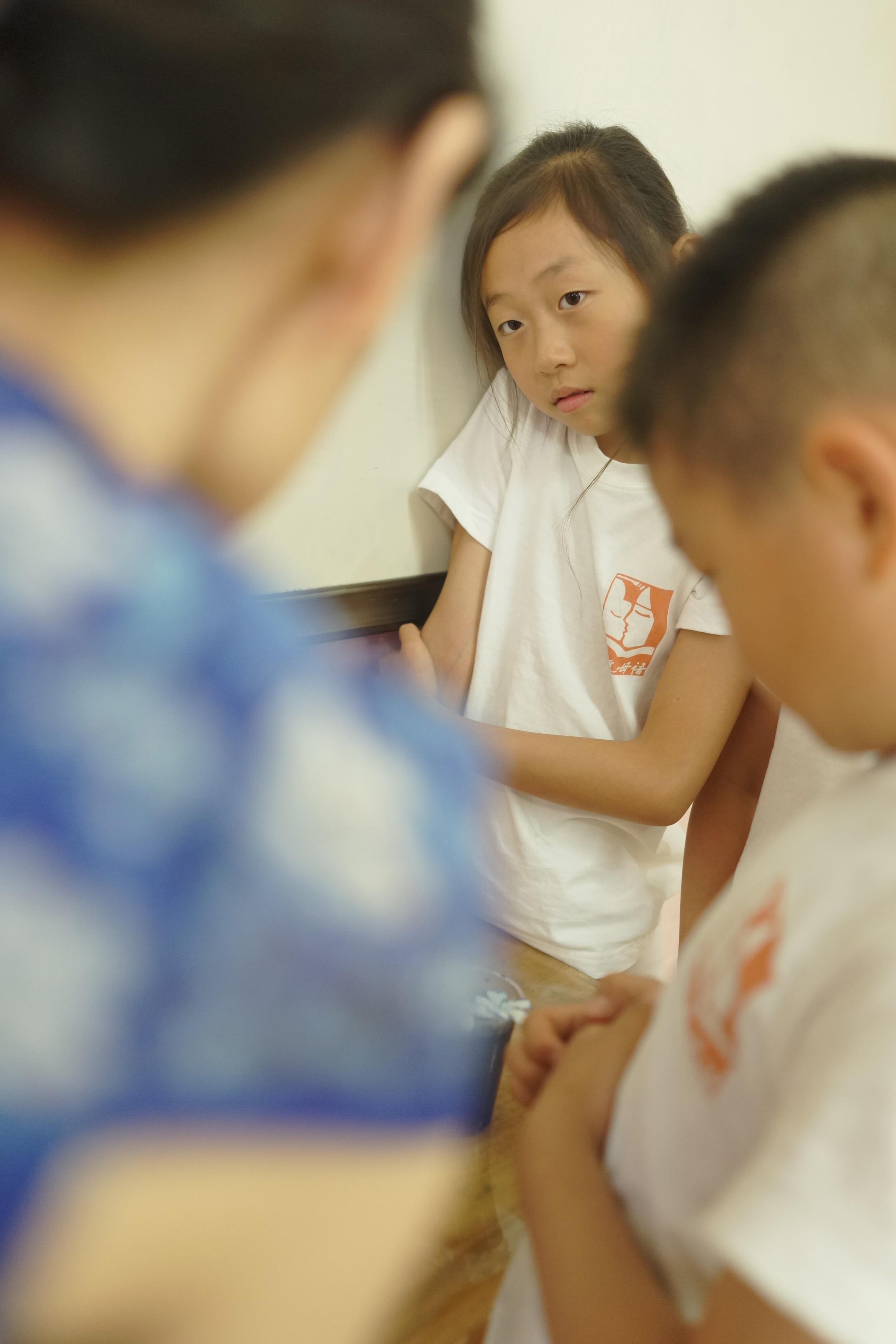 下午睡了一宿的小营员们都精神了不少。紧接着上一次的速成表演课,这一次孙云老师指导大家进阶到中级表演课。这一次《石头汤》的表演已经被分成了5幕剧便于小营员们排演。