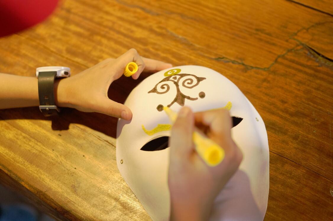 脸谱,是汉族传统戏曲演员脸上的绘画,用于舞台演出时的化妆造型艺术。脸谱对于不同的行当,情况不一。“生”、“旦”面部妆容简单,略施脂粉,叫“俊扮”、“素面”、“洁面”。而“净行”与“丑行”面部绘画比较复杂,特别是净,都是重施油彩的,图案复杂,因此称"花脸"。小营员们用画笔用心描绘,脸谱上的颜色和花纹会反映人物的个性。