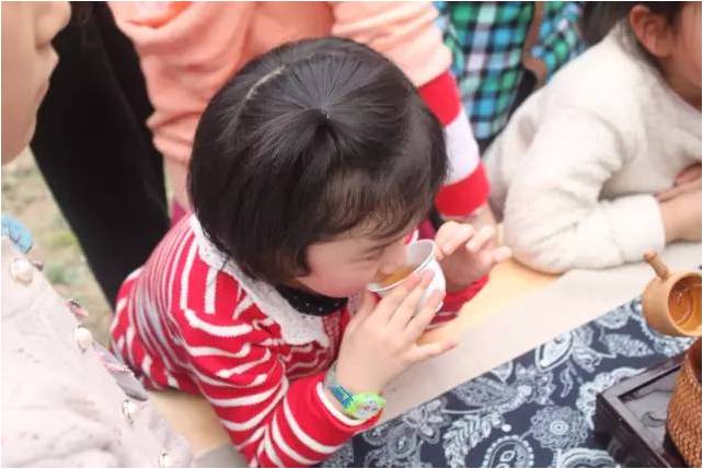 此时,梅花盛开,树枝发芽,花树下品茶正是一件浪漫的事儿。大卫老师在聊完习俗后与孩子们品起了茶。