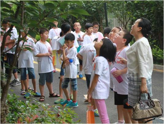 (朱爱朝老师在带领学生们做自然笔记课程)