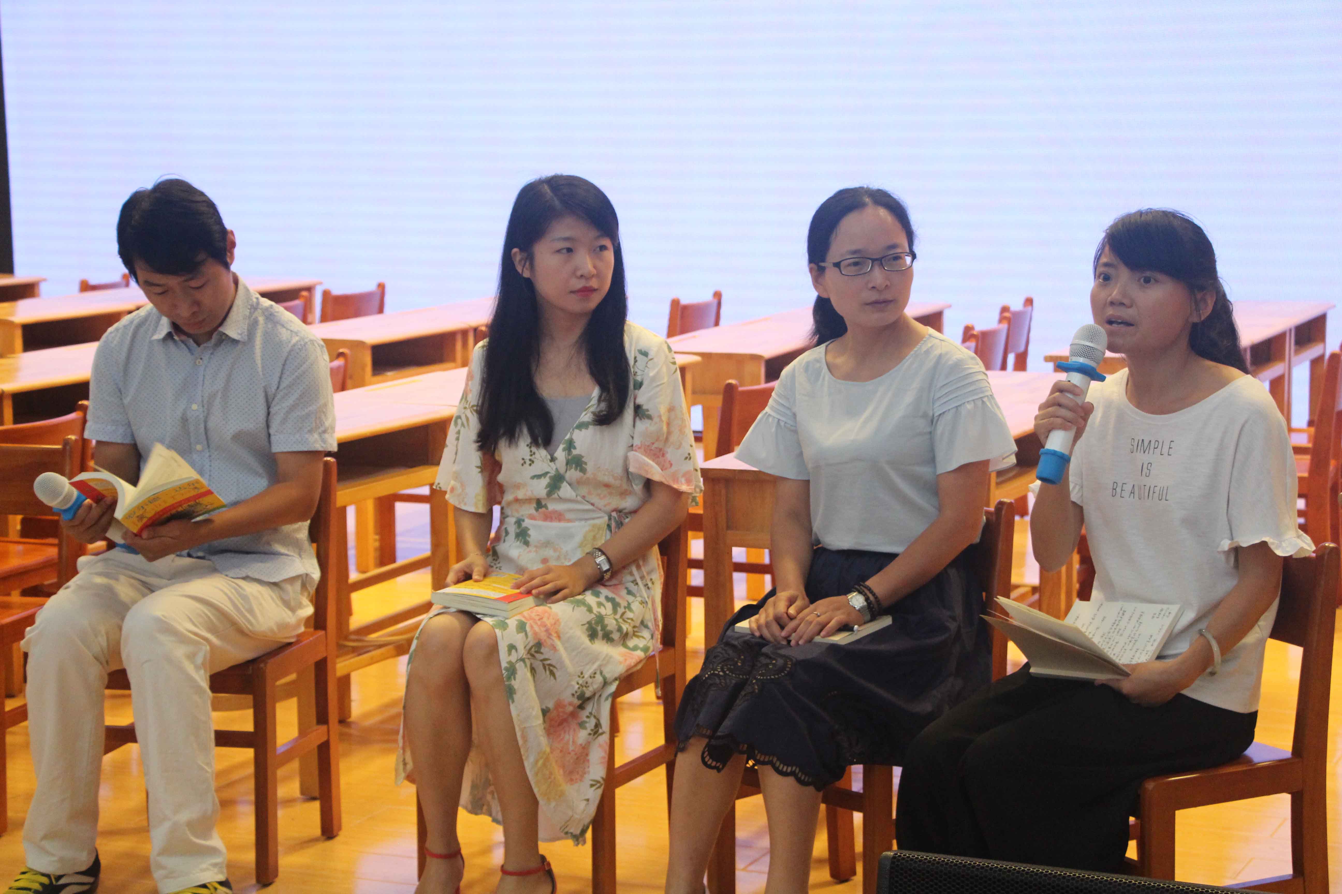 今天进入到整本书阅读与教学专题。阅读、设计《查理的巧克力工厂》是学员的必做功课。读书交流会开始了。四位老师踊跃登台,与大家畅谈他们的读后感。