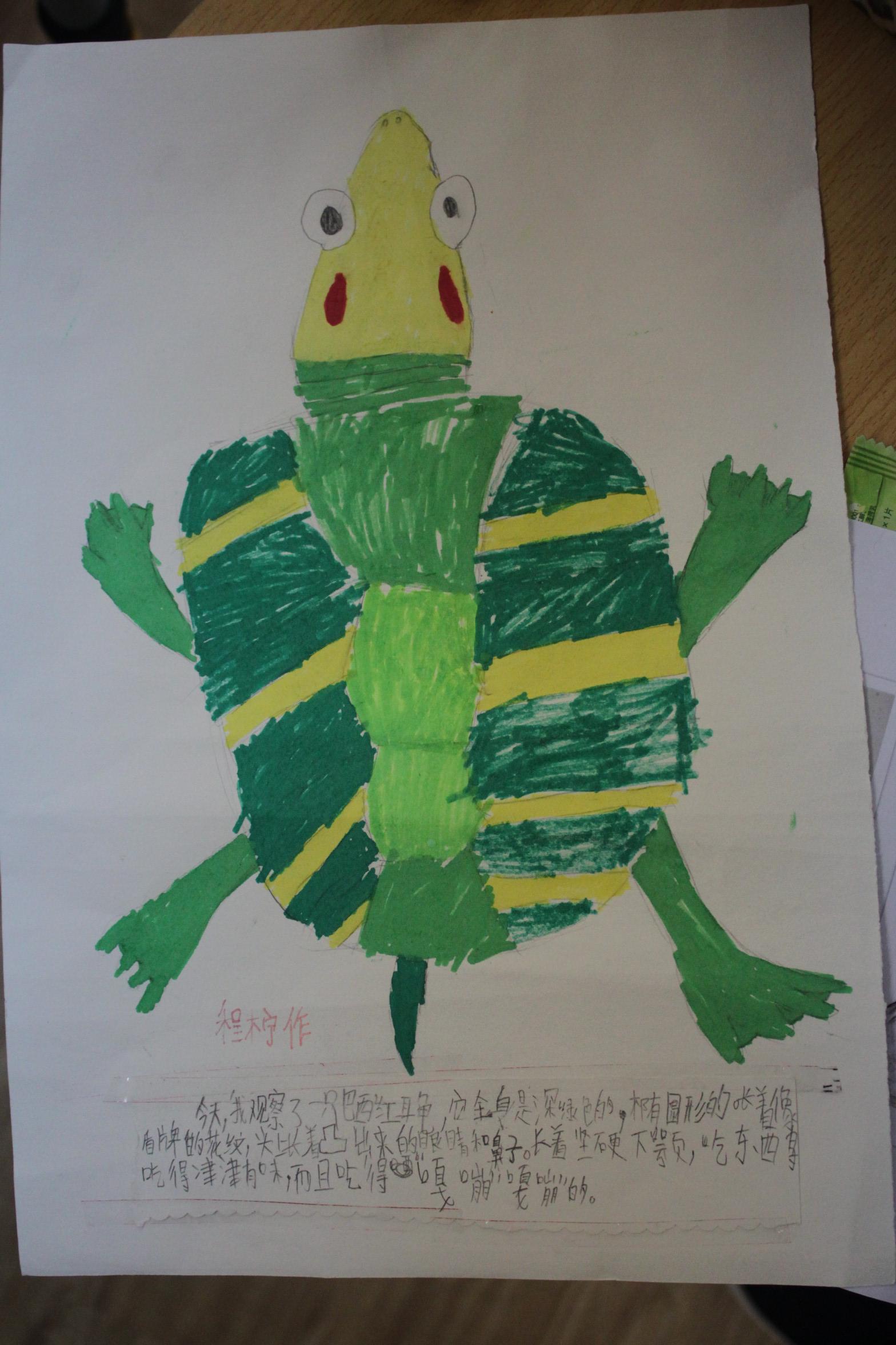 老师:刚才我们观察了乌龟的样子,包括它吃食物时和游动时的样子,现在就让我们将看到的写下来吧!在文字描述之前,我们也可以先来为乌龟画一幅画像,然后在画像旁添加上描述性的文字。这样,看到的人就会更加明白你所描述的乌龟的样子。