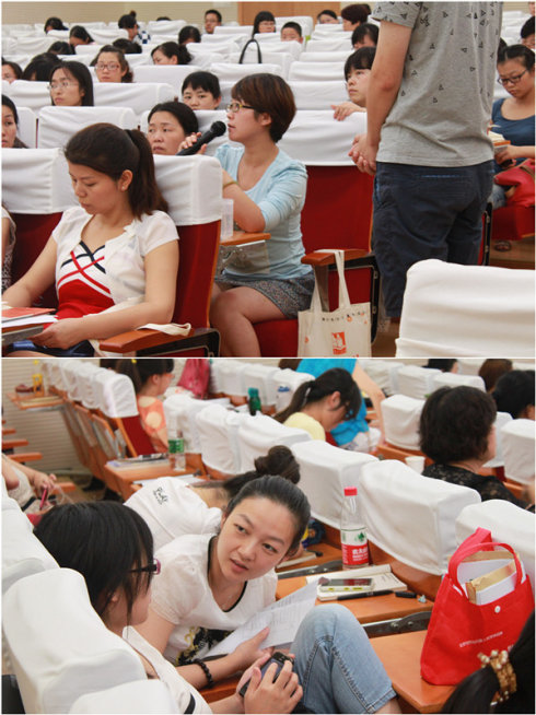 在讲座过程中,徐老师多次提及李琦老师的演讲《我们处在怎样的时代》。关于中国语文教育,非同赞同他对于中国教育模式碎片化和功利化的批判。而亲近母语的课程理念,主张“课程内容大于教学方法”,“语文教材不等于语文课程”。最后,徐老师将亲近母语的课程理念概括为“以阅读为核心,从读到写,到听说,到演(应用和实践),同时辅助以母语文化体验”。随后,徐老师儿童诵读课进行了重点介绍,并采取诵读和问答的形式,与在座老师进行了更加深入的讨论。老师们发言踊跃,气氛热烈。
