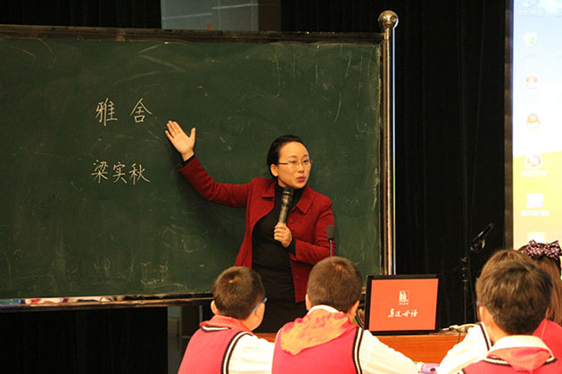 朱爱朝: 第二件事,与文字产生生命的连接。一个人通过阅读诗歌来展示他的内在,另一人是通过读一个作品,把他自己同样深邃的内在与诗歌的作者相遇。现在说的是诗歌,其实所有的文学作品皆如此。孩子们用声音呈现文字的过程,其实他们与梁实秋先生已经相遇了,在不急不徐的叙述里,孩子们感受着梁实秋先生的安然和从容。梁实秋先生的确像冰心先生所说的,像一朵花,有西方文化的洒脱诙谐。一个人和一座房屋之间的因缘,与其对于人生酸甜苦辣的感受,孩子们现在是不懂的,但是它将成为孩子心灵土壤的种子。也许在未来的某个清晨,也许在某个黄昏,有一个句子将如残垣的乐声轻柔地奏响,成为一个人生命的一部分,让人拥有面对生命的平静,让孩子与文字产生生命的连接,并且期待着它在孩子未来生命中的成长,我想这也许是文字对人的最大的意义之所在吧,谢谢!