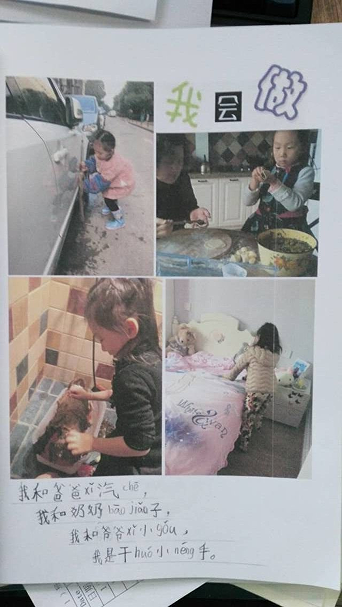 2017 年寒假,对于我的孩子们来说是小学生活的第一个假期,假期的作业布置上我花费了很多心思。除了假期复习我们学过的《日有所诵》以外,我们还可以做些什么呢?学以致用,孩子们通过半学期的诵读,已经找到了儿歌童谣的节奏,有了一定的语感,于是我要求孩子们在完成“学会整理”“我和家人办年货”“走亲访友”等作业中,拍下图片,有兴趣的同学可以模仿《日有所诵》中歌谣的节奏在图片下写童诗歌谣,训练孩子们在生活中自觉仿写儿歌。