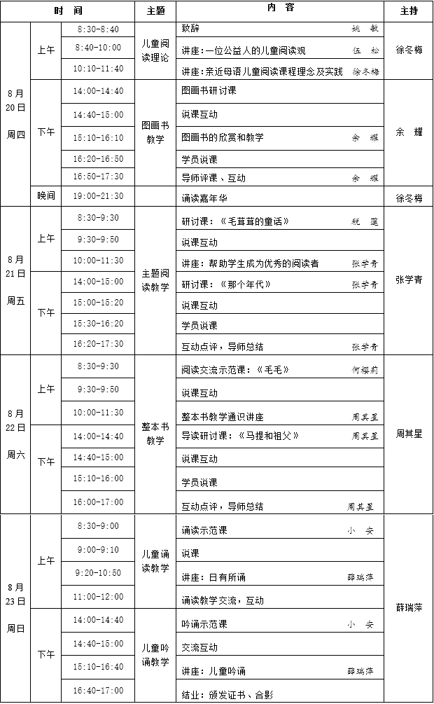 请参会老师认真学习制定网页上关于儿童诵读、主题阅读、整本书课程、图画书课程的通识讲座和相关课程视频资料,了解各课程的基本理念,掌握基本实践方法。网页链接将发送至您的报名邮箱。如没有收到页面链接,请与负责报名咨询的温蕾老师联系。