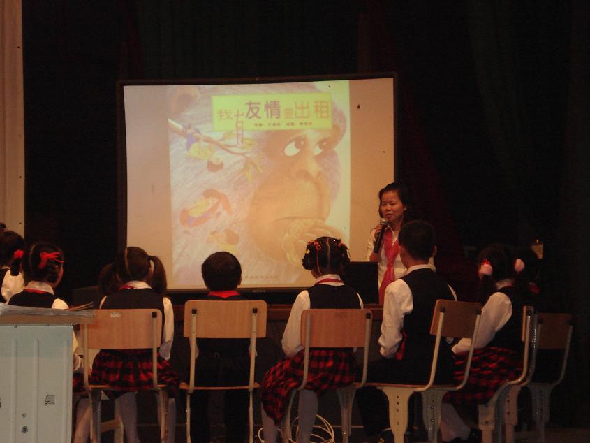 又是一个年轻的男老师,白衣黑裤,他带给我们什么样的精彩呢。仔细听来,真有点说评书的味道呢。会场不时传来开心的笑声。以这种方式给孩子们讲故事,给人耳目一新的感觉。虽然刚刚有老师已经说过这个故事,但真是让人感到了相同的故事有不同的讲法的乐趣。“每个人都有缺点,如果不及时改正的,没准那个没头脑就是你哦……”