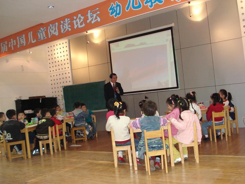 在幼儿教育活动中,年红先生亲自执教,他教学的内容是他自己写的儿歌和歌曲,看到他奔上跳下的样子,我由衷佩服他的敬业。他上课的时候始终是笑着的,孩子们也是快乐的,歌曲最后唱道:白云变成了彩霞。年红先生也把会场变成了欢乐的海洋。他的快乐感染了孩子也感染了我,不禁感慨:许多成年人缺少的正是年红先生的这份快乐。