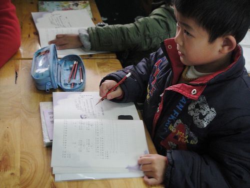 然后是日有所诵的学习。孩子们每人都有一本《日有所诵》。用六分钟左右的时间读两首《日有所诵》里的儿童诗。孩子们读的很专注。