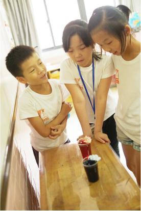 (刘朴涵,蒋好和刘钰璐小营员观察花朵)