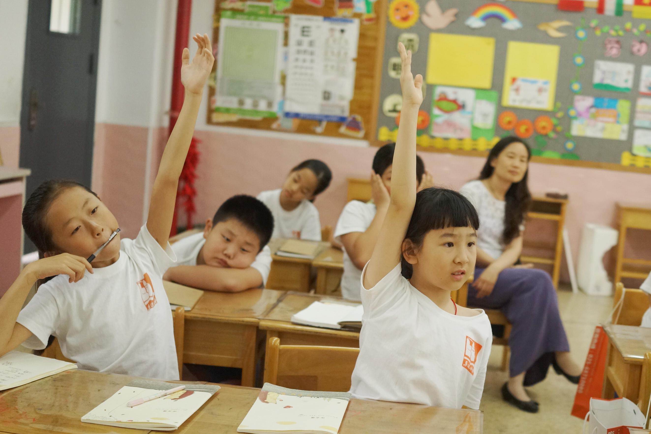 (周诗韵和黄康悦小营员手伸得笔直踊跃发言)