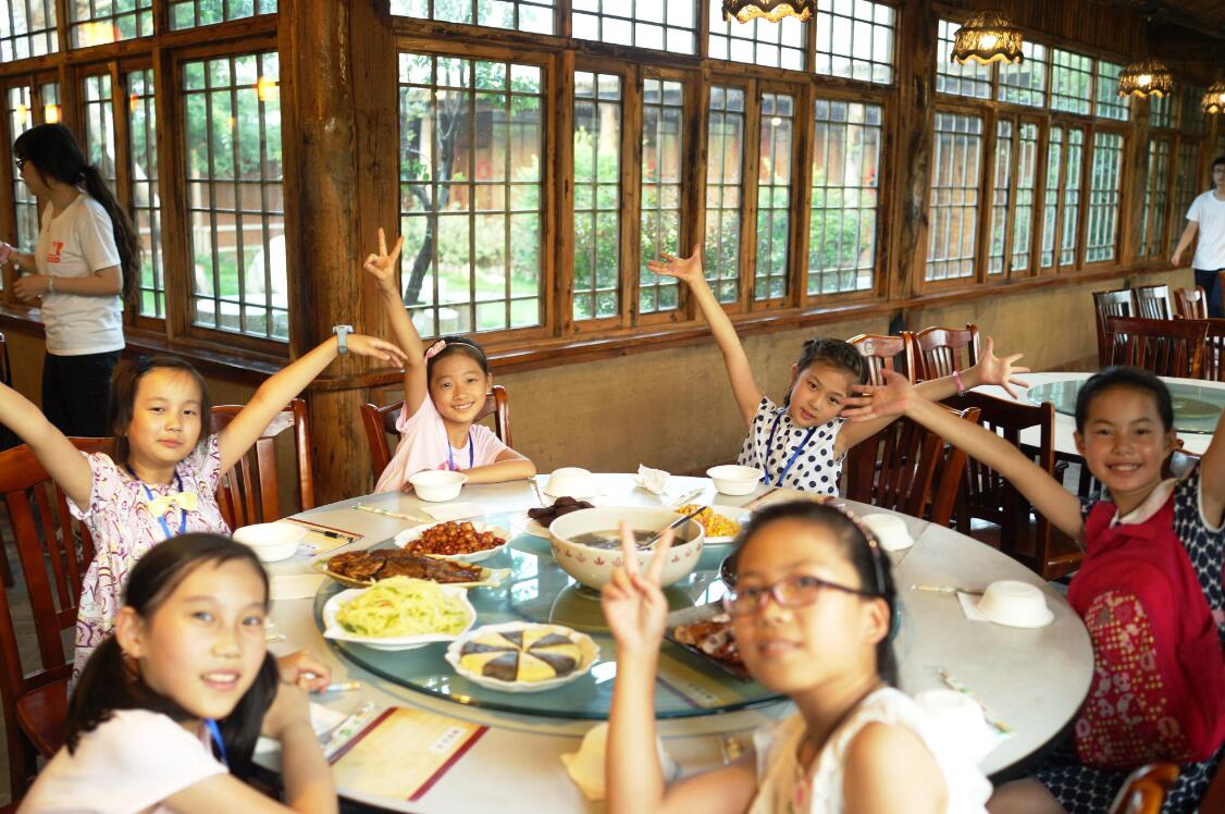 经过一小时的长途车程小营员们终于抵达了此次夏令营的目的地三国村。卸下沉重的行李,小营员们终于可以饱餐一顿啦。