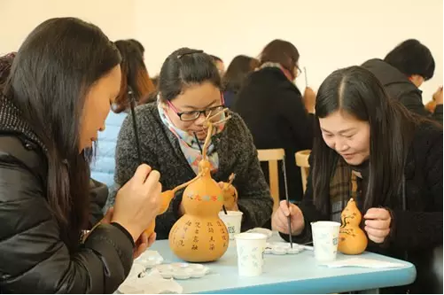 彩绘葫芦课上,非遗传承人张苗老先生教大家如何在葫芦上作画《九九消寒图》。简单介绍了葫芦的历史文化后,张老师讲解九九消寒图的来历和画法。左手执葫芦,右手执毛笔,点墨,蘸水,于葫芦身上勾勒梅花的枝干,后用红色颜料画出竞相开放的梅花,再随心情所好提上字,作品即成。彩绘葫芦作品各有各的美好和寄寓,老师们玩得不亦乐乎。