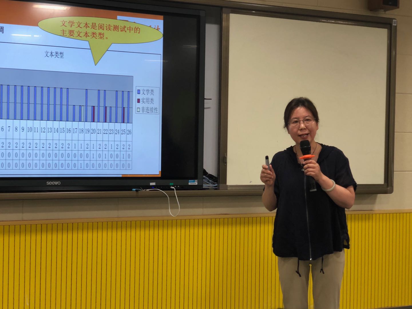 刘主任指出了当今阅读测评存在的问题:文本类型失调,能力项目失衡,内容赋分失当以及考察内容失常,并对阅读测评目前存在的不足和问题等方面进行了具体、全面、客观地分析。她以今年高考语文卷结构为例,启迪阅读测评的重要性。刘主任认为,测评真正的功能应该是对于学习——为了学习——作为学习的过程,更重要的是作为学习,“测评也是一种学习,作为学习的部分,即在测评中学习,在学习中测评,测评的目的是一种评价,改进,引领。”刘老师如是说。