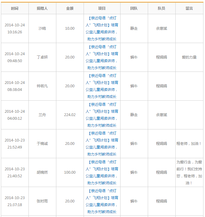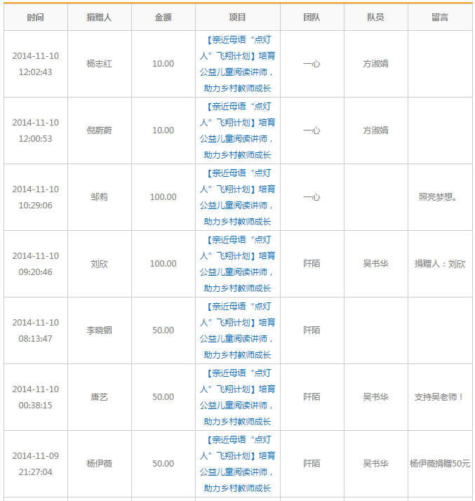 注:【亲近母语“点灯人”飞翔计划】是一项为儿童阅读公益组织提供专业性师资支撑的公益服务项目。此次捐款人数达585人,以下图片仅显示部分名单,可登录 为爱行走 官方网站查看捐助详情。