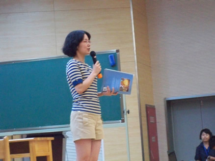 在简单开幕式之后,亲近母语课题组核心成员刘颖执教一堂图画书阅读课《藏在名画里的猫》。一开始,刘老师就用温和的语言,亲切地和孩子们交流着,把孩子们带到了故事的情境中。孩子们渐渐地被刘老师清晰的讲述了吸引住了。找不同,比较讨论,刘老师用孩子们喜欢的方式参与问题的讨论。“真实的自我,自由的向往”这些成人也会困扰的话题,在孩子们不断地思考和碰撞中,发出智慧的火花。