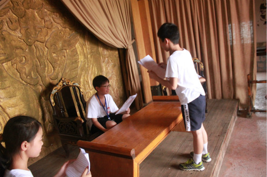 室外的暑气已经减半,营员们分队来到室外的周瑜大帐和点将台排练话剧。